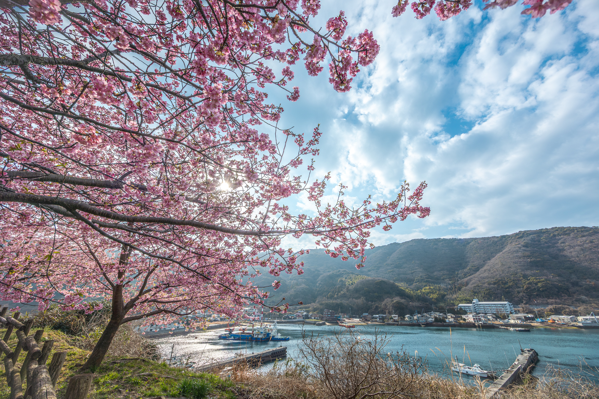 山口県の絶景めぐり【上関町の河津桜】〜海峡と空を背景に映える花の絶景〜