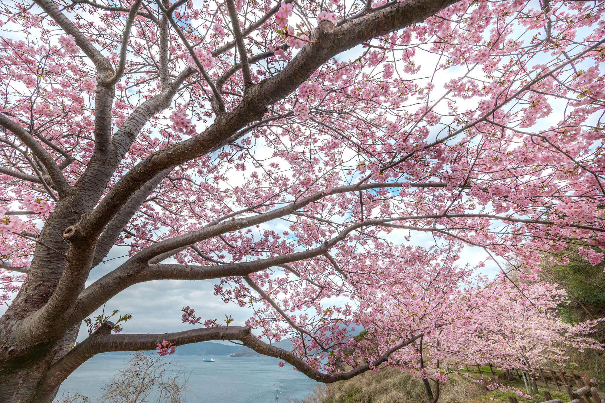 【桜越しに上関海峡を通過する船も見える】