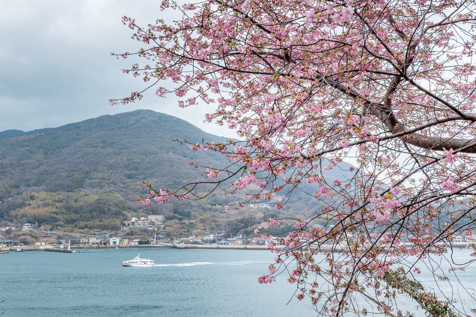 桜の間から、室津から祝島へ向かう定期船「いわい」が見えました。
