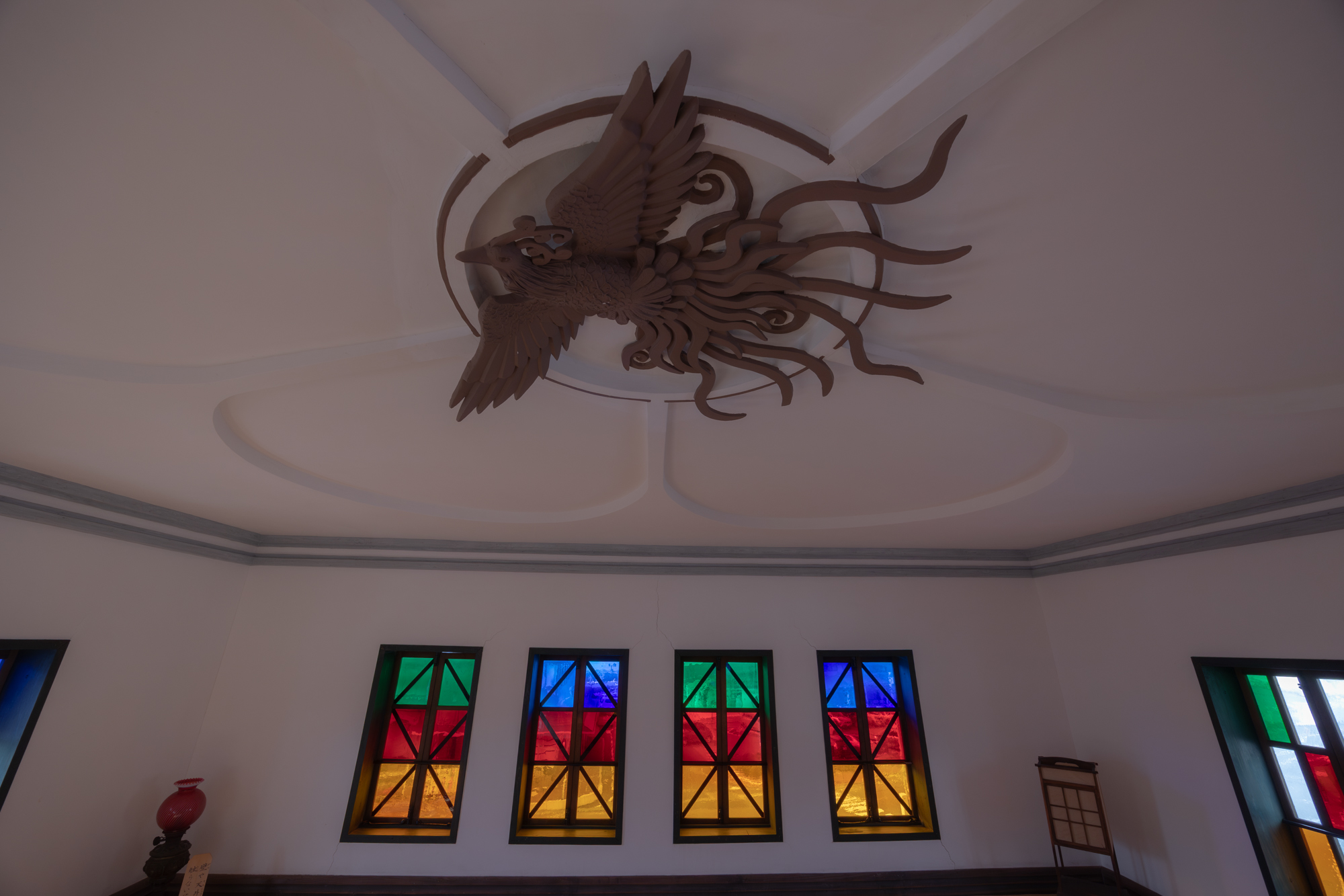 鏝絵と呼ばれる、漆喰を塗った上にこてを使って絵を描き出す技法が各所に施されており、4階の部屋の窓にはフランス製のステンドグラスが施されている。