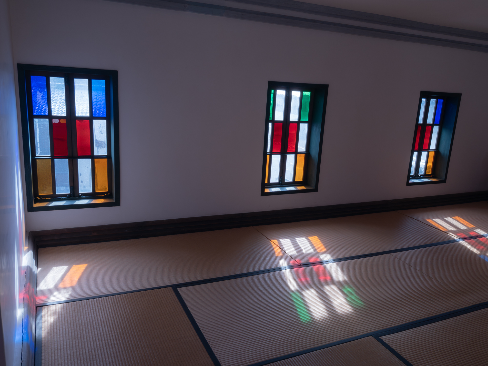 【ステンドグラスの光が畳に映し出される】