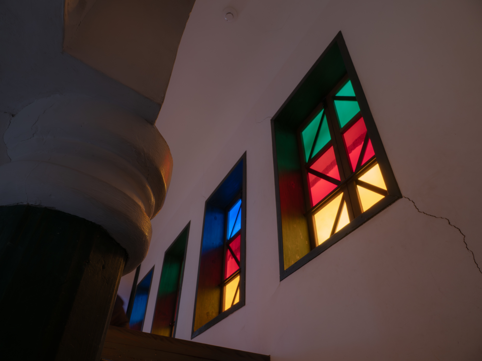 【階段を上がっていくとステンドグラスが見えてくる】