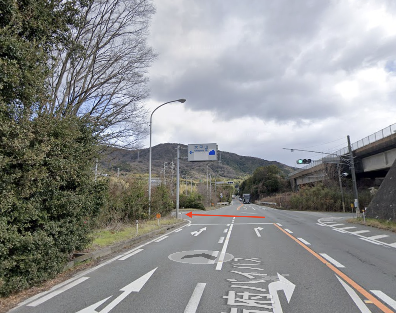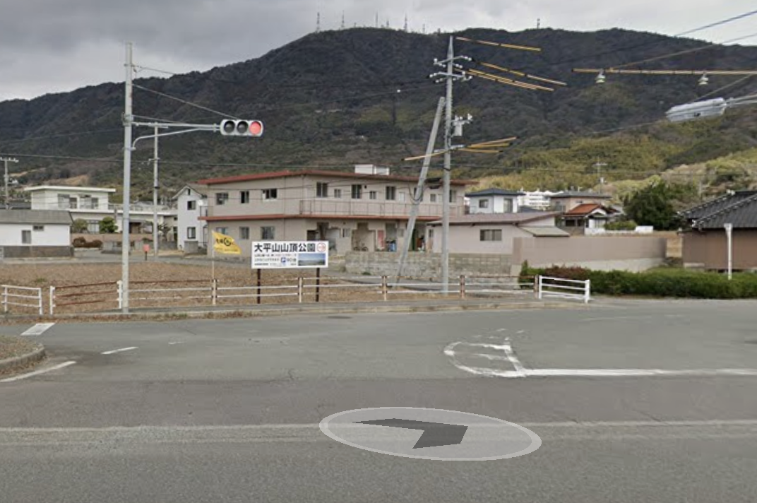 国道2号線を走っていると、「大平山」の案内標識が見えてきます。この「大平山交差点」を山側に入ります。