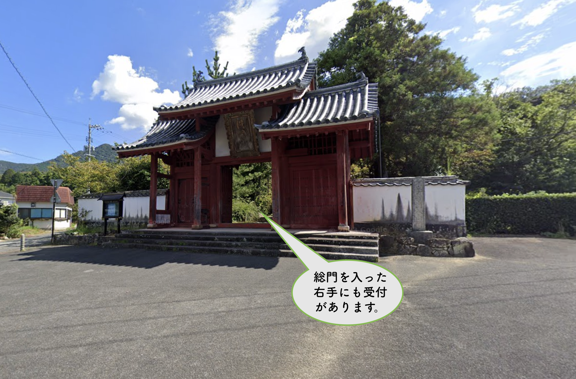 駐車場から2分ほど歩いて坂道を下ったところに総門があります。そこをくぐった右手側にも拝観受付がありました。